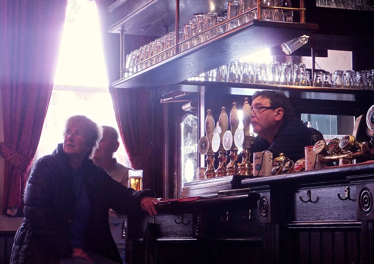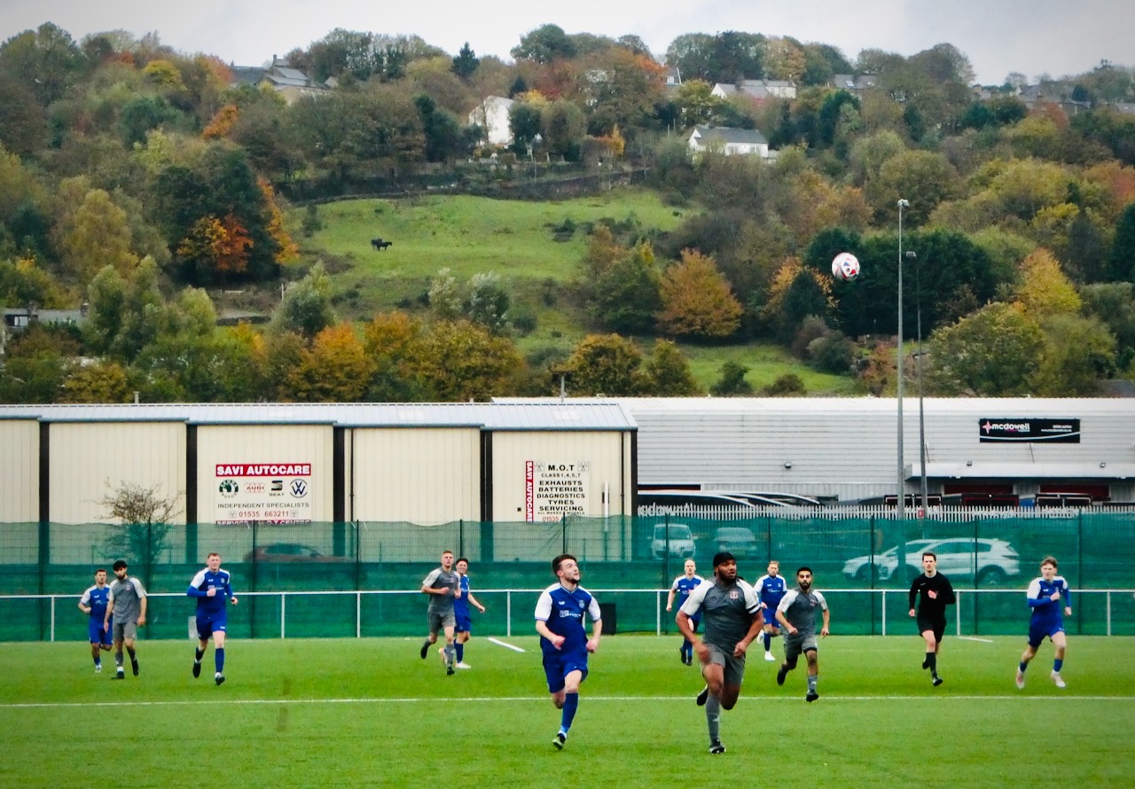 I pick this shot for the colour palette mainly — the blue of of his jacket works very well. It is taken from inside the ground, as the reversal of the lettering makes evident. As you can also see — it is raining, a lot. But the game behind me did manage to reach a conclusion. Nothing to do with Keighley Cougars, a rugby league club (you have never seen rugby league depicted on here, and unless I radically change in my remaining years, you never will) — the owners of that club decided they fancied a football team as well so simply bought one, Eccleshill United of Bradford, and teleported them here for as long as they feel like dabbling in another mode of football.