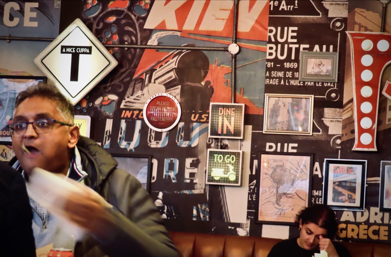 And so, the trip back from London, and that invariably means King’s Cross is the departure point. I quite like the Giraffe café, on the balcony above the concourse — it’s a fairly agreeable railway station all round, in fact. Maybe the guy eating the sandwich might feel his depiction is a little unflattering but at least it catches the lunchtime moment.