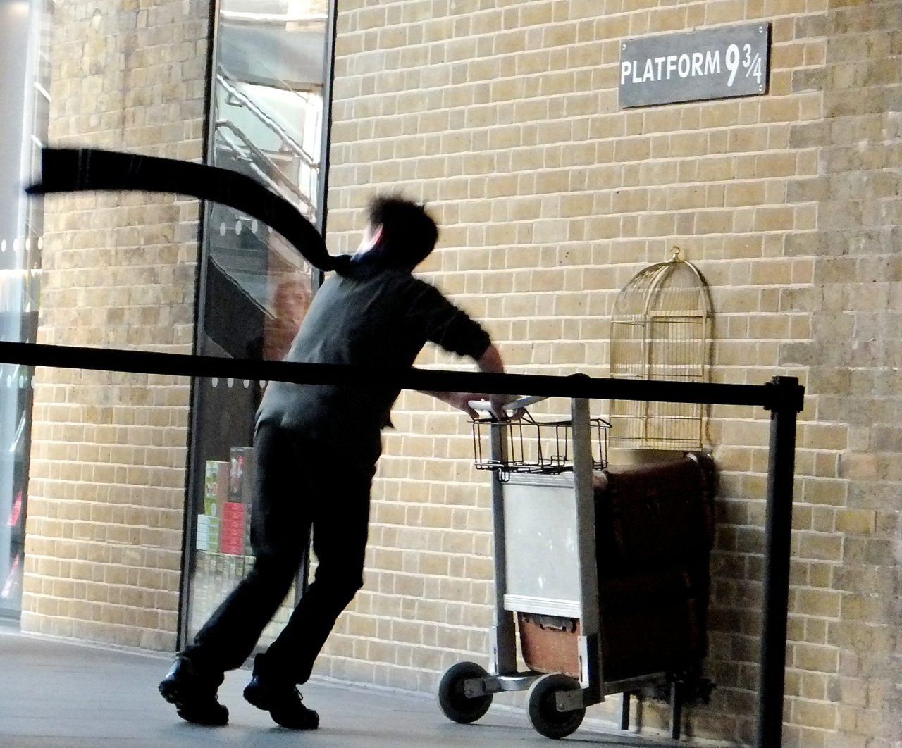 With 40 minutes to kill in King’s Cross station on our way back from Brighton, I entertained myself by watching these activities. When the new King’s Cross was opened a couple of years ago this little memorial had been installed seemingly by the builders, and was left largely unmolested; when the Harry Potter shop opened and colonised it shortly afterwards, and started charging visitors to get their mitts on the trolley, the queues, absent before, started appearing. QED.