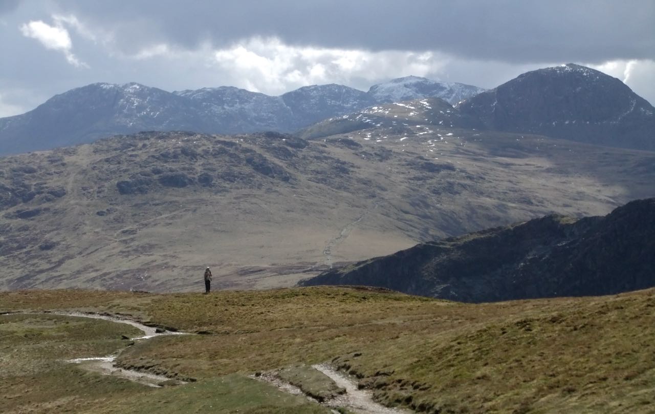 Incidentally, the snow-covered peak second right is Scafell Pike, the highest mountain in England. The dome to far right is Great Gable. Between where the walker (and photographer) stand and the slope behind is a steep valley holding the motor road of Honister Pass.