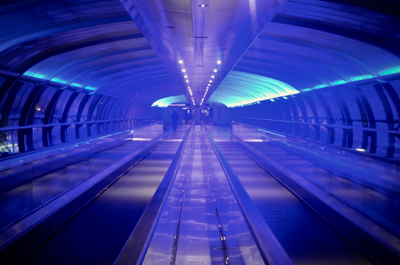 A study in blue, or possibly, ultraviolet. A study, also, in how full symmetry is so rarely possible, however hard one tries to achieve it. I will be flying out of here tomorrow, but for tonight, the airport hotel.