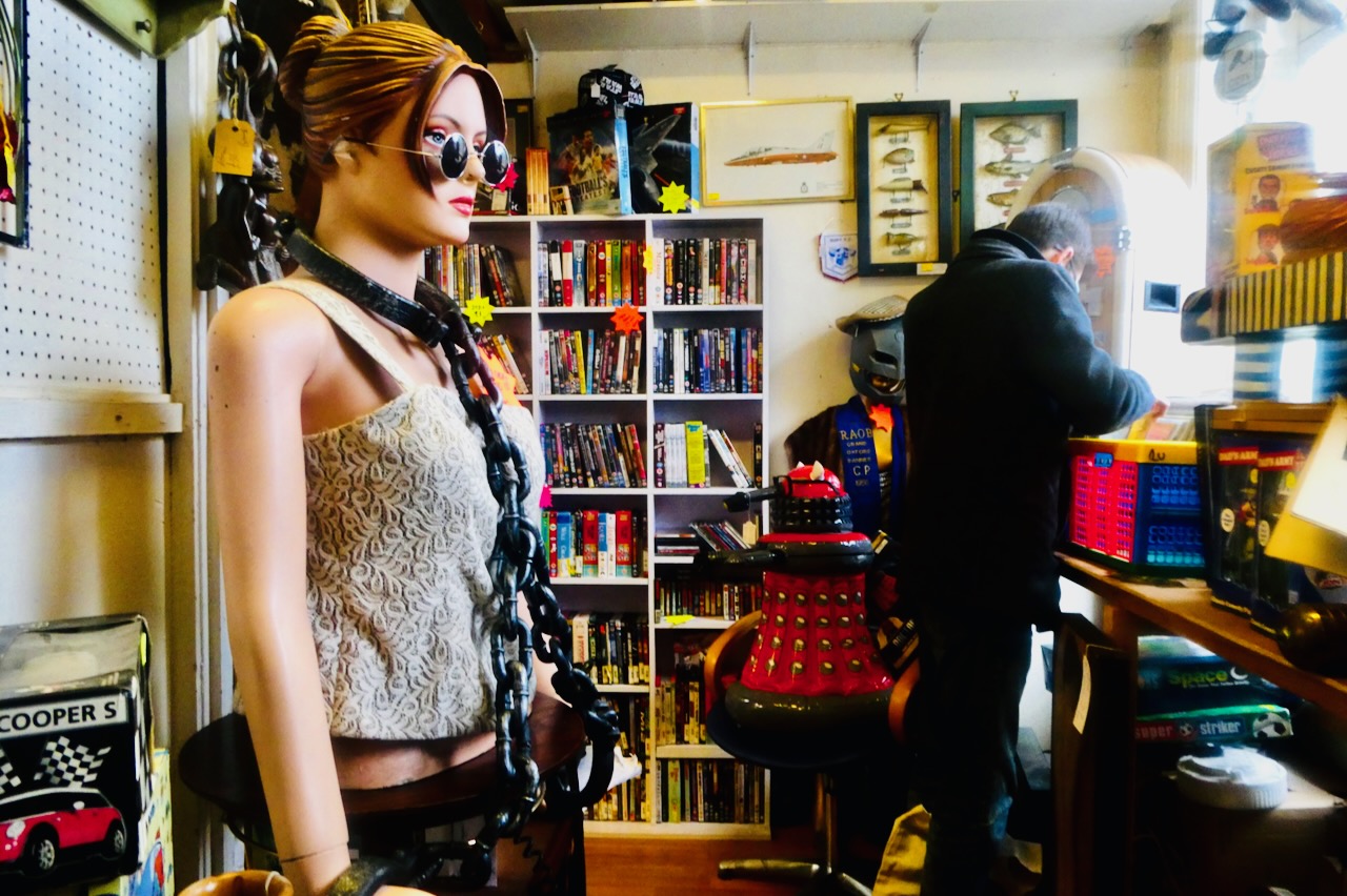 Anyone who thinks that an ‘antique’ shop these days is a guarantee that the products for sale are somehow all going to be more than about 20 years sold is fooling themselves. But these places are good to visit, and to photograph. This place in Ramsbottom even outdid Hebden’s equivalent spot. Why this mannequin is done up in bondage I have no idea, but even she is upstaged by the Dalek behind.
