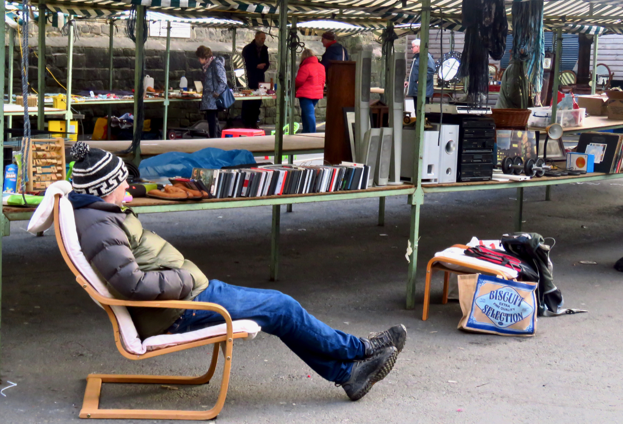 The outdoor stalls at Todmorden market stay there permanently, and well before the presumed 9am opening time of the rest of the enterprise, this guy was out with his boxes trying to get the early morning trade. There wasn’t any, hence the title of this post. I like this shot because it’s the one I was trying to take, and the car headlight poking through the struts is the final bonus.