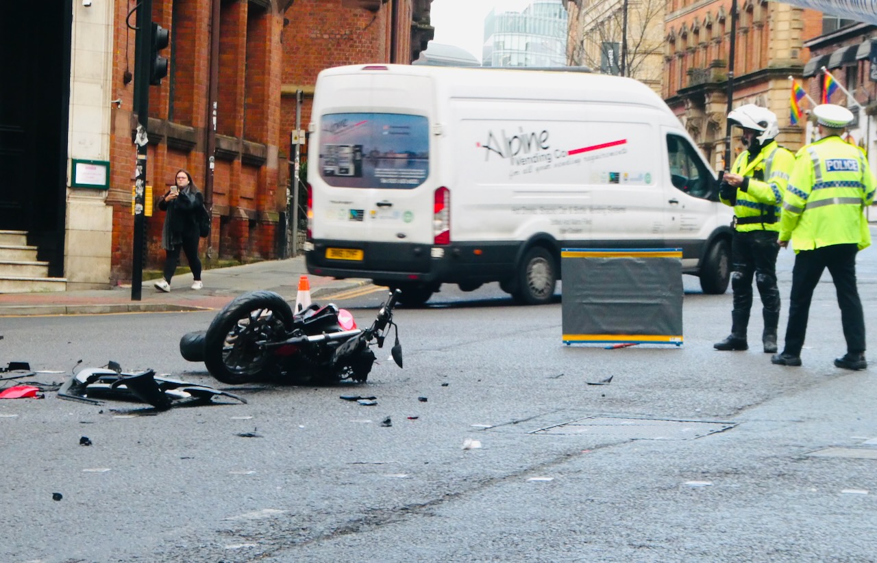 I am sure my day in Manchester was better than it was for the driver of this bike, lying at the junction of Princess Street and Whitworth Street, a place I walk past every time I go to work. So, seeing where the debris lay and knowing this junction and its patterns of traffic and pedestrians and stop/go signals, I suggest that this is what happened here — the bike was coming downhill, down Princess Street, as was its due, and the the car that it hit (bits of which were also scattered around), coming uphill, decided to turn right across its path. Shite driving therefore, lack of attention and care: at least the motorcyclist lived (I checked the story on the Manchester Evening News site), but that’s scant consolation I am sure.