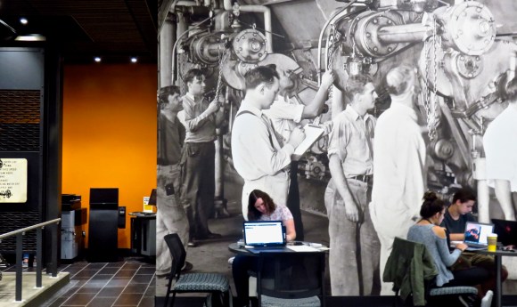 Another campus to add to the list — Purdue University in Indiana, the people who were good enough to invite me to the USA in the first place on this trip. This place is especially known for its programmes in aviation and spaceflight — Neil Armstrong studied here (which is a cool alumnus to have) — and engineering, hence the nickname of its football team, the Boilermakers. This mural in the campus’s new learning center, open only a week, reflects this. It was a day where I was too busy to particularly get around to taking many photos, so this was a rush job I know, but there’s one thing I do like about it, which is the apparent anachronism of the guy standing on the left of the big picture: is that a cellphone in his pocket? Sure looks like one. (Actually it’s a slide rule, apparently.)