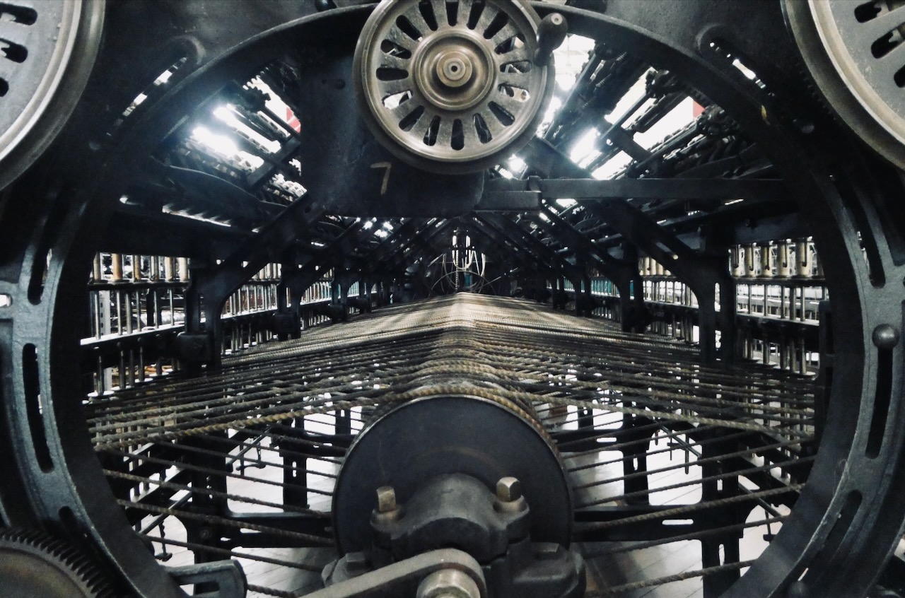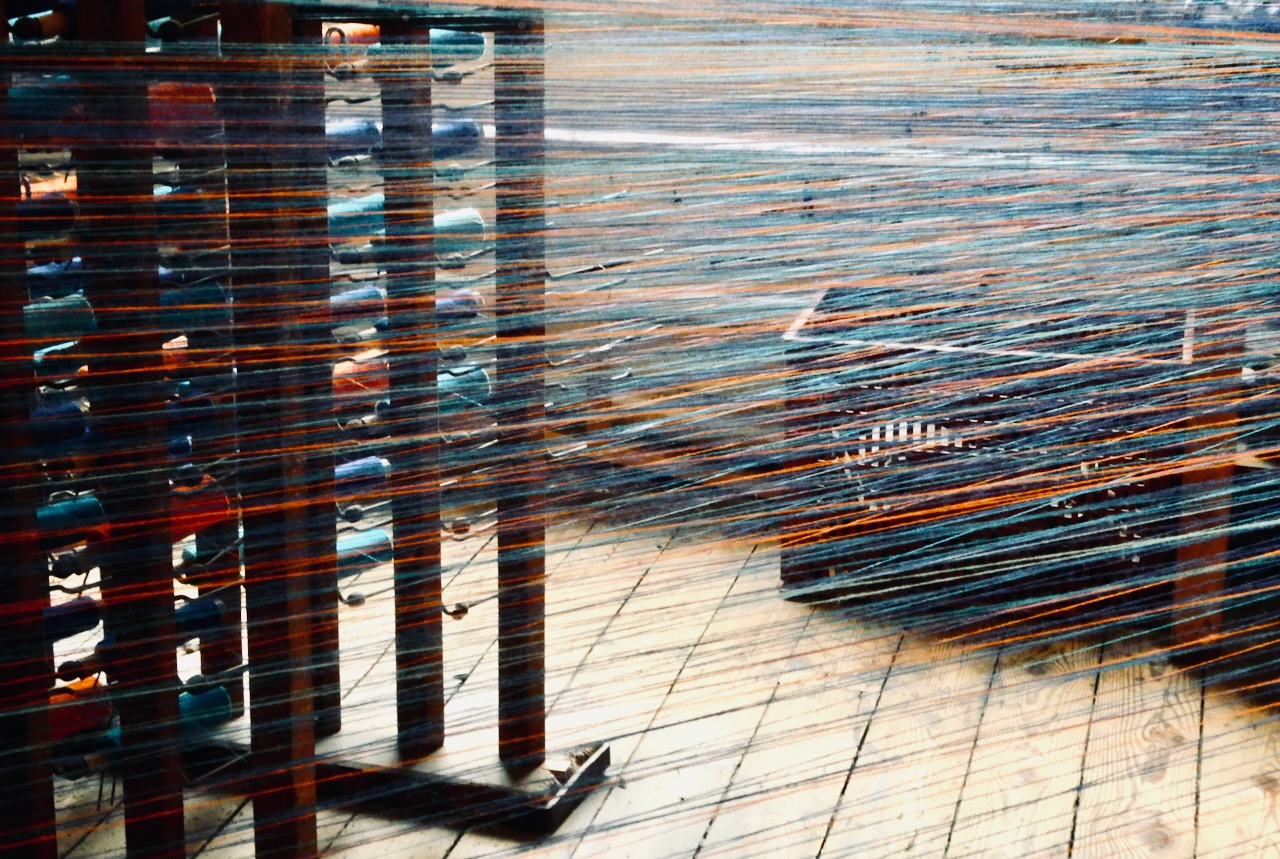 But for the photo, I’ll go with this mass of red and blue strands of wool, all converging into the Jacquard loom that is currently operating to the right, having been turned on for a few minutes during which time it produced plenty of noise and a few dozen lines of carpet.