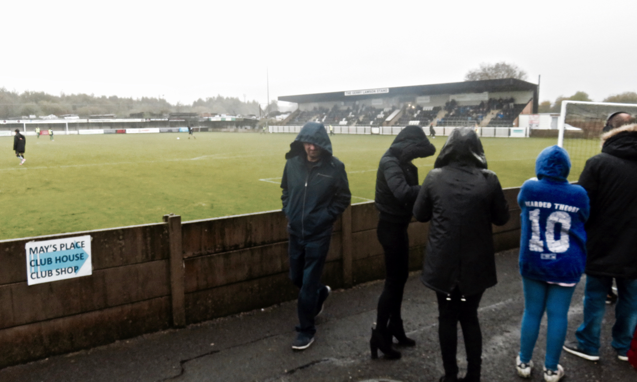 The tour of English football competitions continues: number 8, the FA Trophy, at Bamber Bridge FC v Brighouse Town FC, Bamber Bridge lying just south of Preston in Lancashire. A grim day of weather, which this picture encapsulates — but, I must also add, an excellent day out, entertaining game of almost wholly non-cynical football, welcoming stadium… a fine cocktail to celebrate Non-League Day and all the roots that keep the sport I love going in this country. 4-2 to Bamber Bridge in the end. Maybe some of these fans got their food before the second half, too.