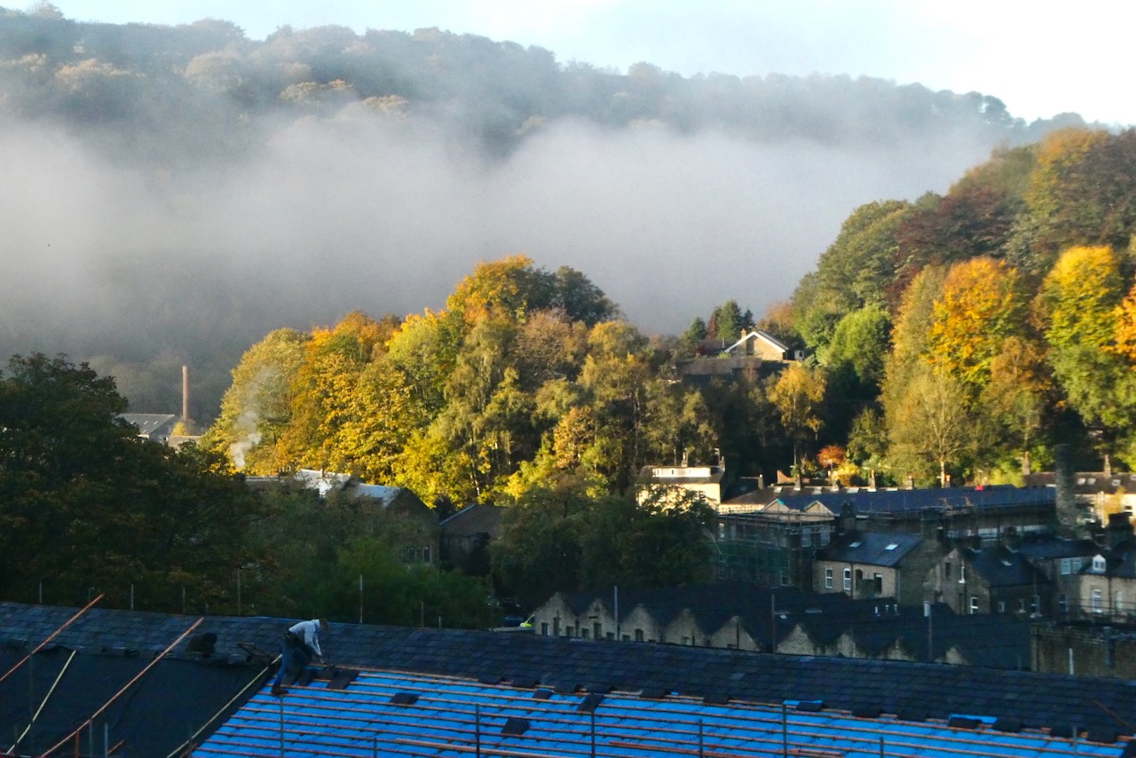 The roofers have been working on Nutclough Mill for weeks now. Months, even. But there are worse mornings to be up there.