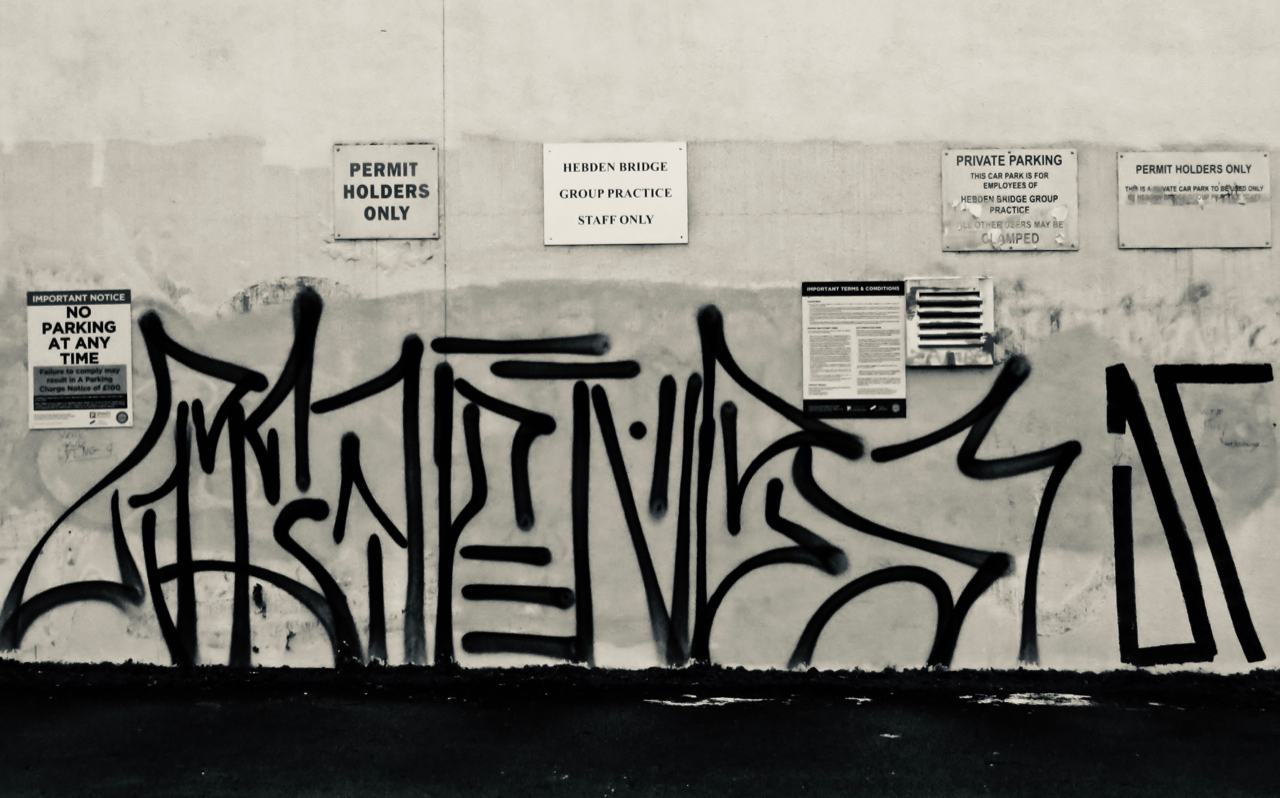 Which is less savoury — the graffiti, or the notices which pepper this wall and try to keep the space private and enclosed? At weekends, at least, the town could do with the parking spaces. Eventually someone will come and paint over the street art, but the warning signs will remain.