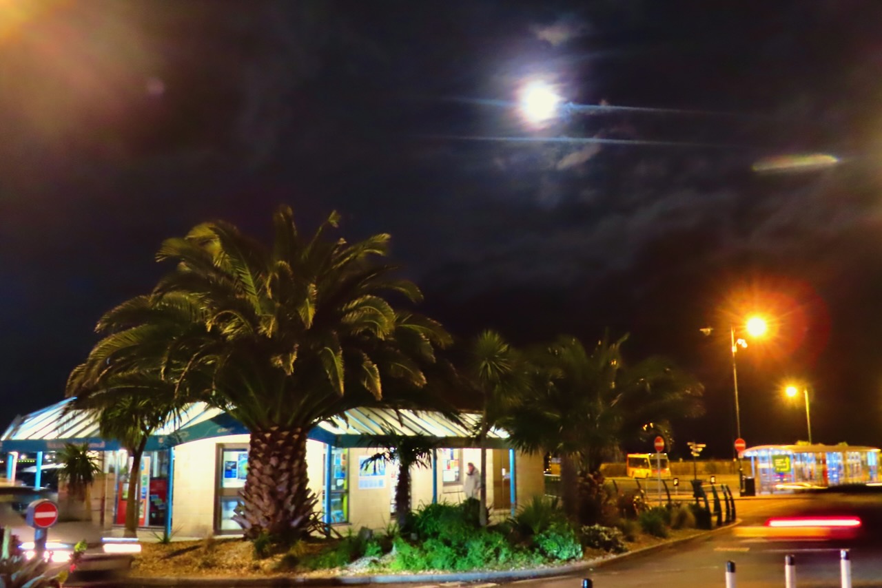 This photo is garish and could certainly be sharper but with my camera in the state it is presently in (following the still-painful St Helena Tarmac Incident) it is as good as we’re going to get at the moment, after dark. I like the picture anyway: first, it represents that moment that I finally got to have some fresh air after nearly 11 hours on three separate trains today (none of which had on-board catering) and second, that I arrived in what is both the most southerly and most westerly decent-sized town in Britain, namely Penzance, Cornwall. Where you get to see palm trees outside the bus station. We’re not in Yorkshire any more, Toto.