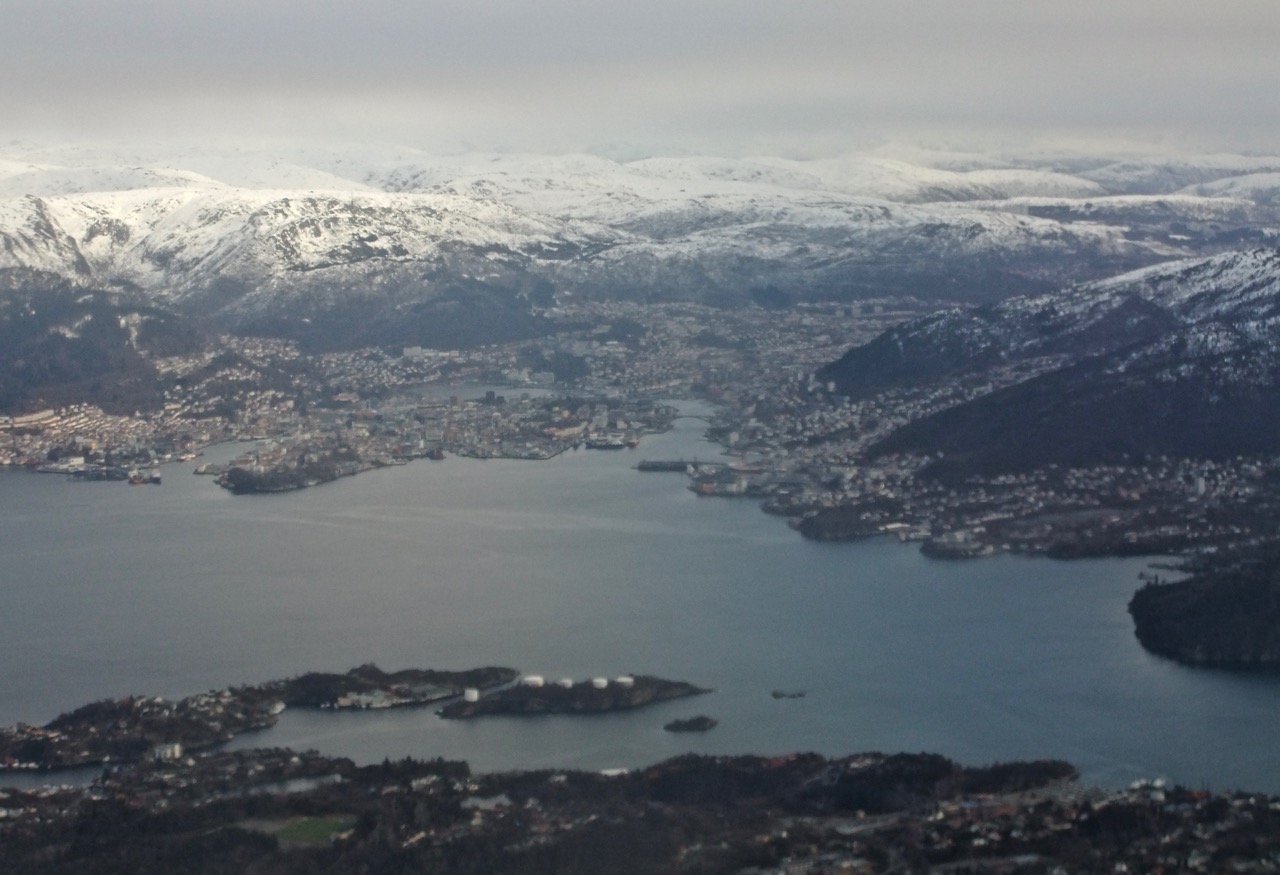 The peninsula to left-centre of this photograph is the historic city centre of Bergen. Mount Fløyen, which you saw on 27th November, is the low-looking hill to the far left, below the snowline.