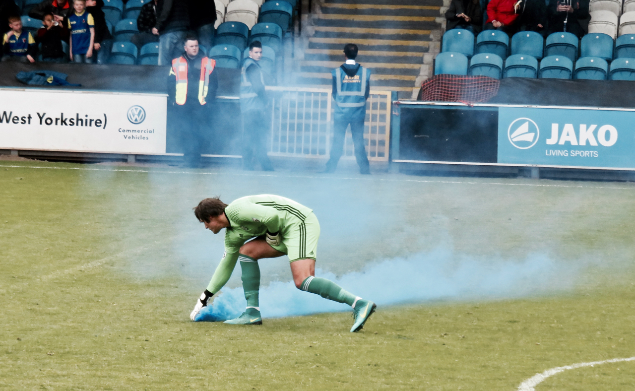 After last weekend’s semi-final victory over Salford, Halifax Town duly beat Chorley 2-1 (after extra time) to get promoted back to the fifth tier of English professional football. 7,920 people were there to see it, an amazing crowd for the level of football (and a record for the National League North apparently). Sam Johnson, Halifax keeper, here clears a flare off the pitch. I’m telling you it was all happening at The Shay this afternoon….