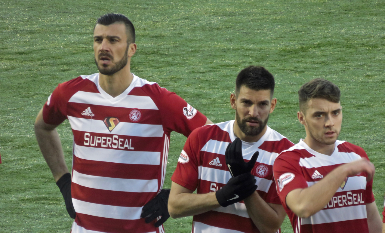 Another stop for Joe and I in our efforts to see lots of different football competitions in one season — today was our 13th, the Scottish Premier League. Hamilton Academical have a great name and I like their red-and-white hoops. I can identify the player on the left as their captain Xavier Tomas; not sure about the other two however, but let me off — we were not even supposed to be here today, having headed for a different game entirely which was postponed as we arrived in Glasgow, hence this emergency replacement, which made all my prior research irrelevant. Accies should have won, but their failure to put the ball in the net when given clear chances to do so meant they lost 1-0 to visiting St Johnstone.
