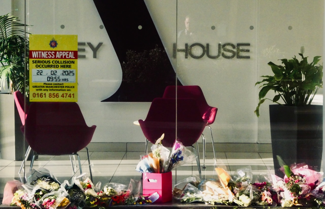 Whatever happened on the 22nd February at 9.55am happened while I was in Dubai, so I do not know the details. But going on the location, at the junction of Booth Street and Mosley Street in Manchester city centre, the ‘serious collision’ was most likely between a car and a tram — something which really shouldn’t happen in broad daylight. The tram is never going to come off worse in such an encounter. One therefore assumes the memorial flowers — note the £3.50 price tag visible on one bunch — are for at least one occupant of the car. And their ghost keeps a careful watch.