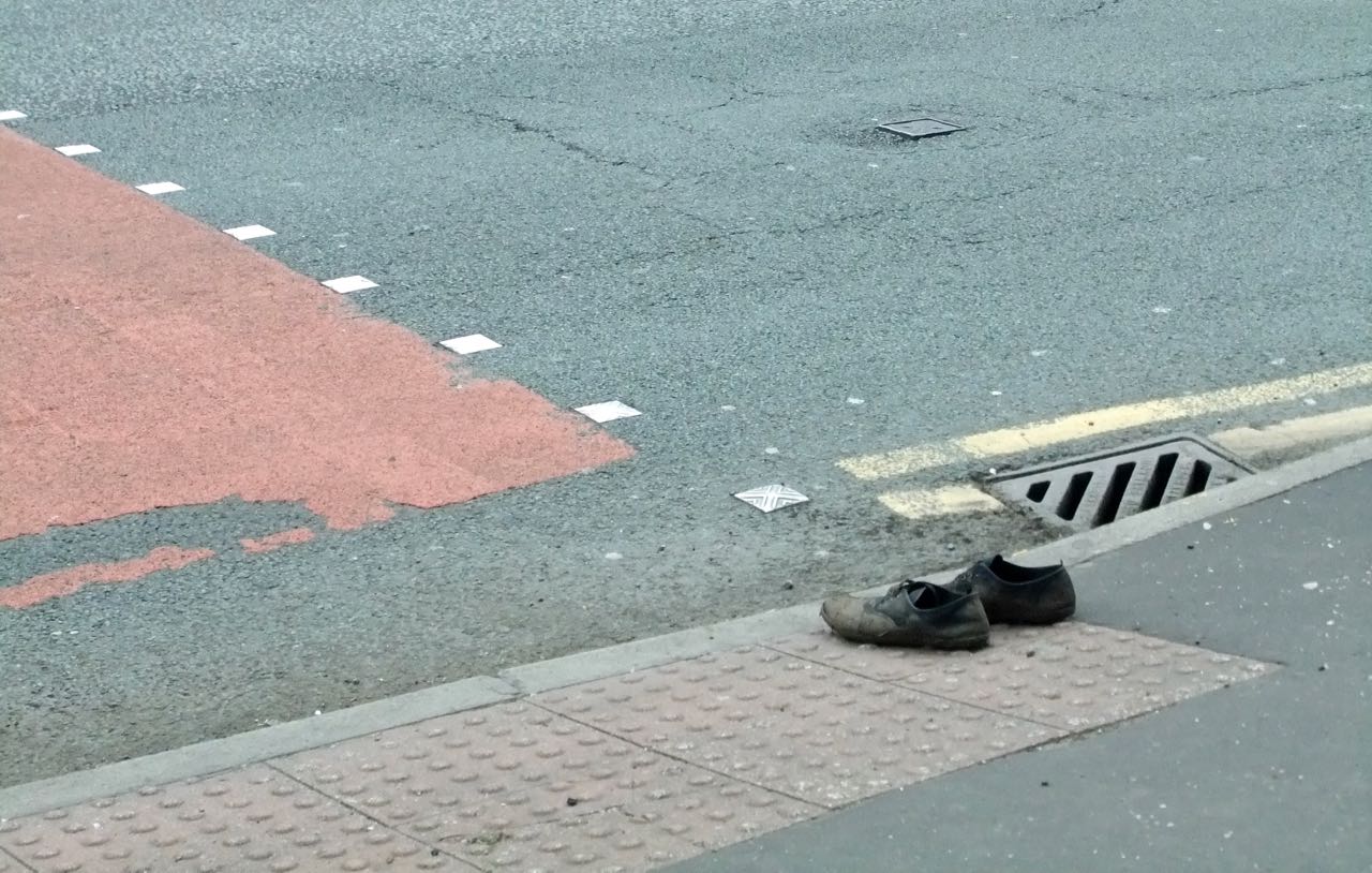 Not quite the latest pic in the ‘abandoned shoes’ series, as there is a pair here. Along with the other items they seem to have been placed beside the Keighley Road pavement deliberately, for collection and subsequent use by anyone who needs them. So if anyone in Hebden Bridge does want an old telephone, a plastic wine glass, a nail file, the shoes or the other things which were in the pile but unseen — feel free to go and inspect.