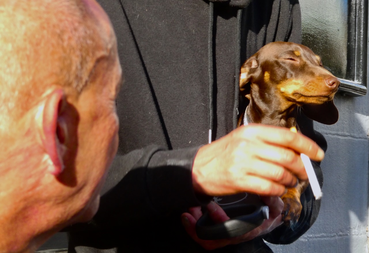 I’m as satisfied with this portrait as I can be. Important elements come together: the woman walking past; his ankle (and what it implies); the just-lit cigarette.