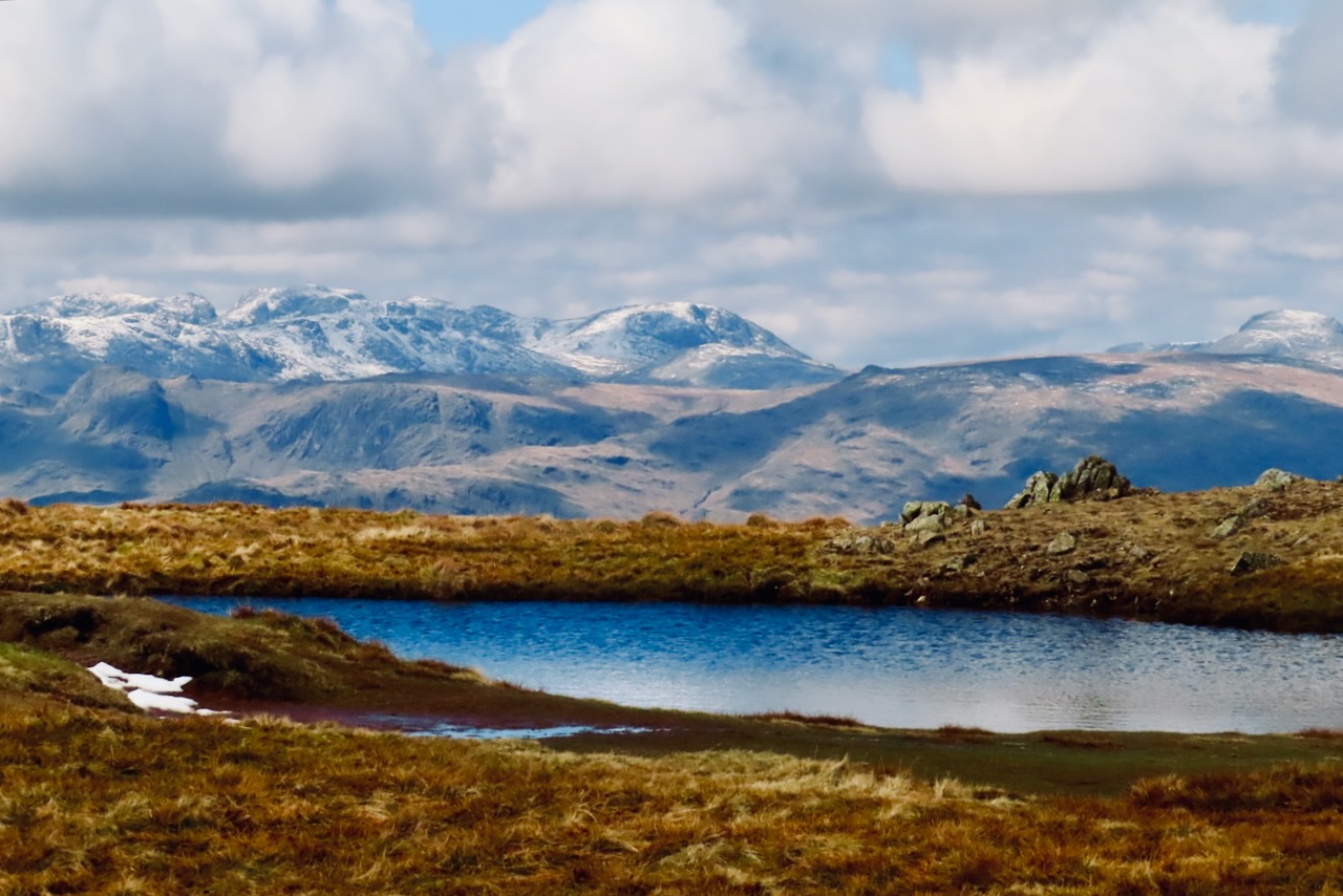 The summit known as Red Screes, with its substantial tarn, sits at 2,541 feet above sea level but is still considerably lower than the Scafells: left to right from the edge of the picture, Scafell, Scafell Pike and Great End. Great Gable pops up to the right. A fine day to be out walking even if the transport arrangements once again…. but what the hell, I expect too much perhaps. Read more on the other blog, if you like.