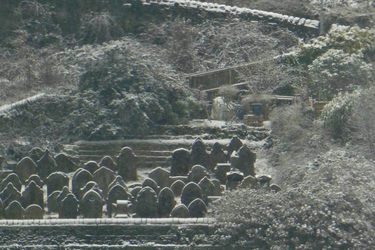Snow was forecast and duly arrived, though it was hardly a winter apocalypse. It did make the town look good, though. This graveyard sits on the hillside across the valley from my house: it takes a long zoom to pick it out in a photo and, usually it’s all rather brown and unprominent. But I like the way the snow picks out the headstones, like rim-light, almost.