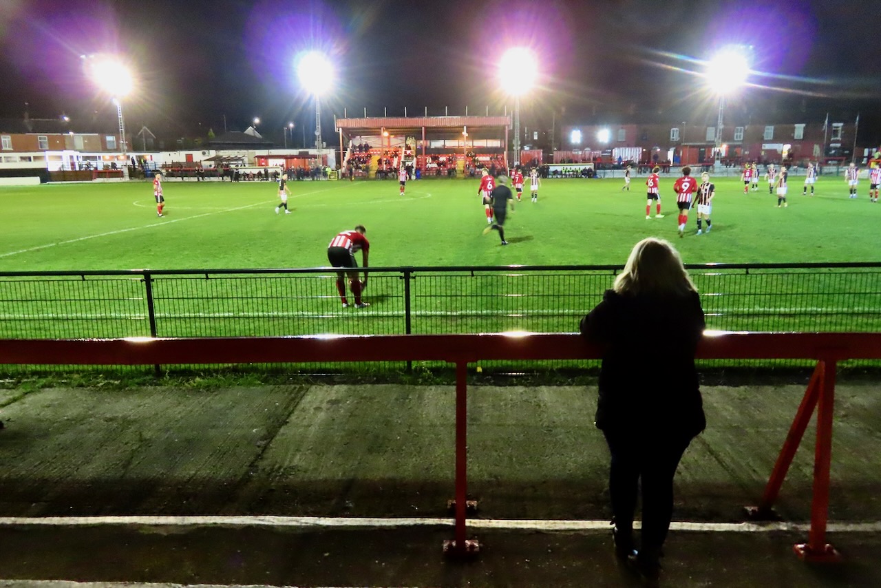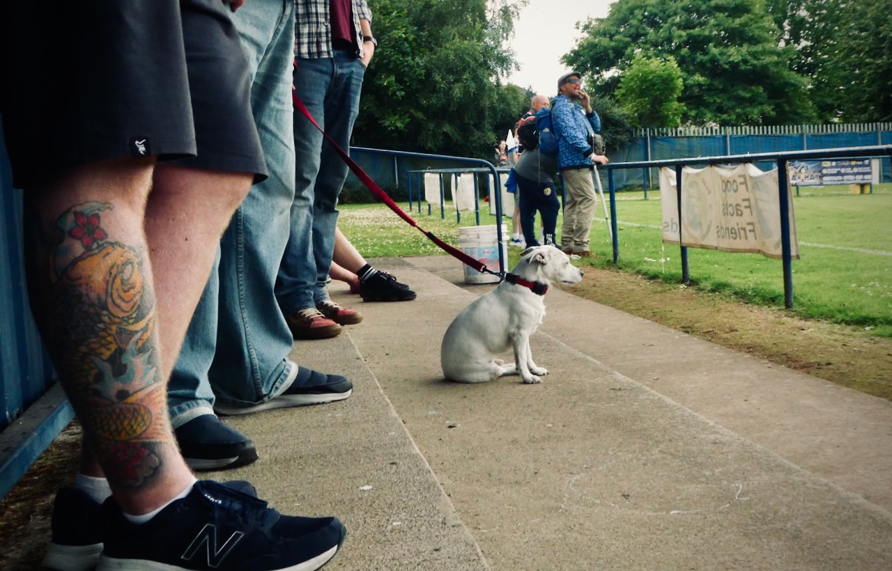 The younger members of the small crowd at AFC Bentley v AFC Phoenix disport themselves in an aesthetically pleasing manner over the little main stand. It would have been very easy for this one to have been cluttered up by a number of things — signs on the back wall, or dangling wires, maybe — but other than at the bottom right corner, these things are not present (and I did consider cropping further, but then the standing couple would have been too near the edge). I doubt any of them particularly cared that the visiting team won on the day, they were just enjoying the sunshine, as was I.