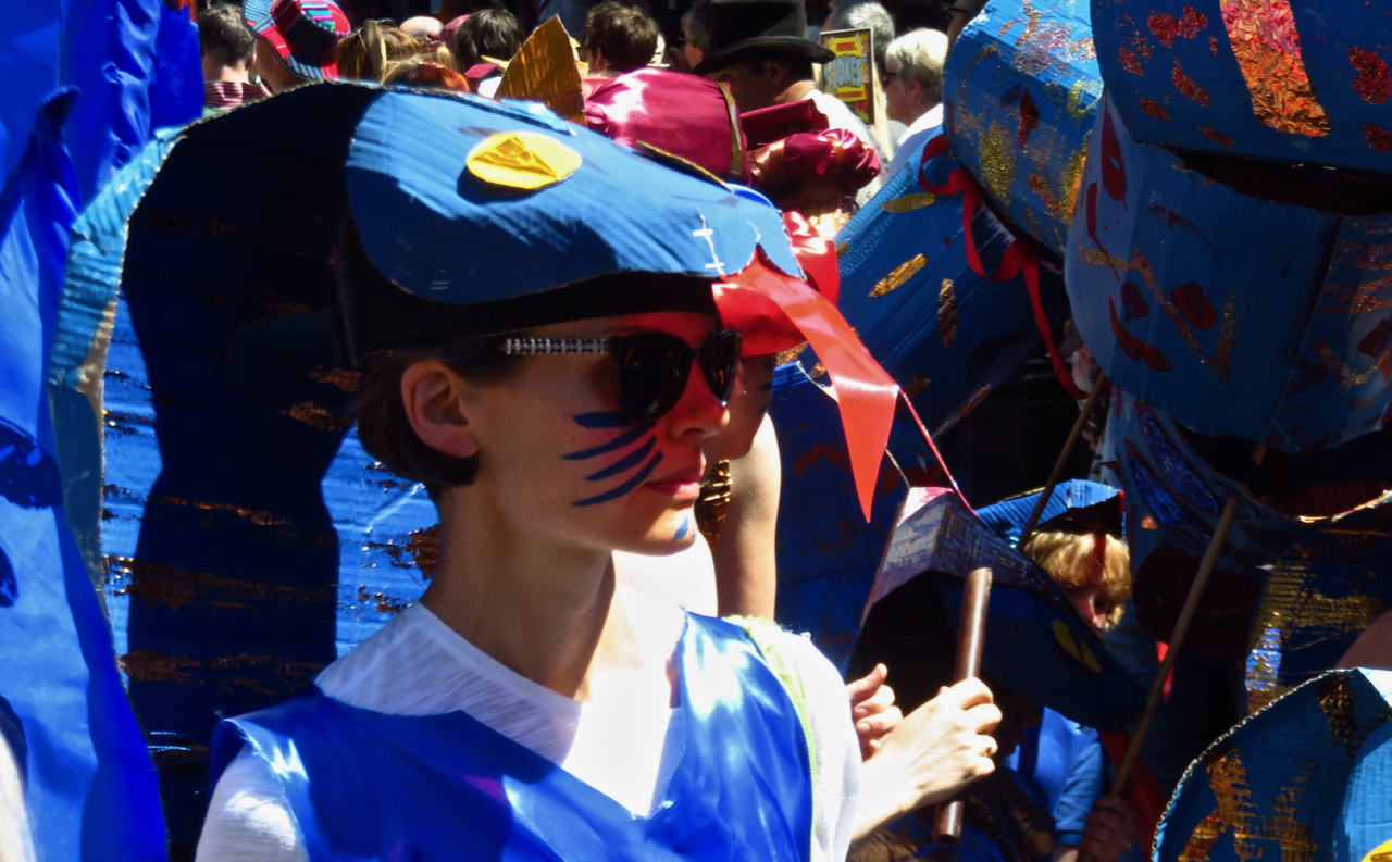 Hebden Bridge’s annual ‘Handmade Parade’ has featured on here every year since the blog started, and will probably continue to do so. Although it is easy to be blasé about it when it’s seen every June, it remains an amazing outburst of creativity from hundreds of people, done purely for the sake of one performance along the main street of the town, which lasts 90 minutes or so — and for no direct commercial reasons whatsoever. Long may it continue. If someone can look this sophisticated and cool while wearing a large blue cardboard snake’s-head as a hat — then there must be benefits to it.