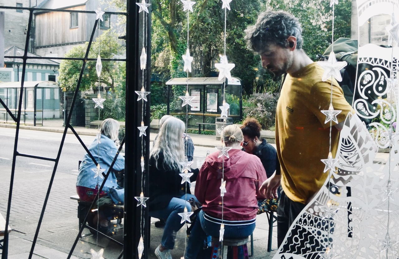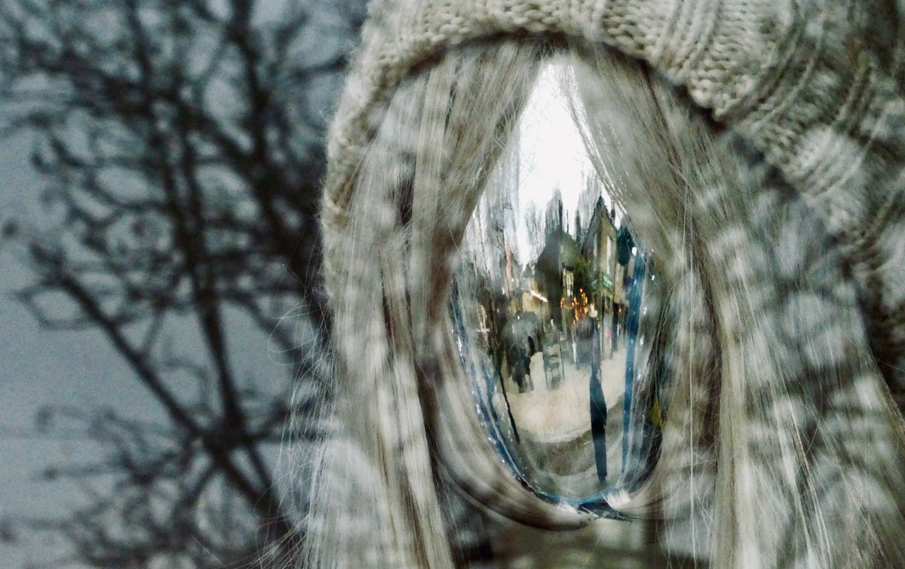 But then the trees over the road crowd in, reflected in the glass of the shop window, plus, is that a self-potrait of the photographer captured in the lower part of the parallel dimension that seems to have opened up where that face should have been? Ghostly….. Or, possibly, just a bad photo, but here it is anyway.