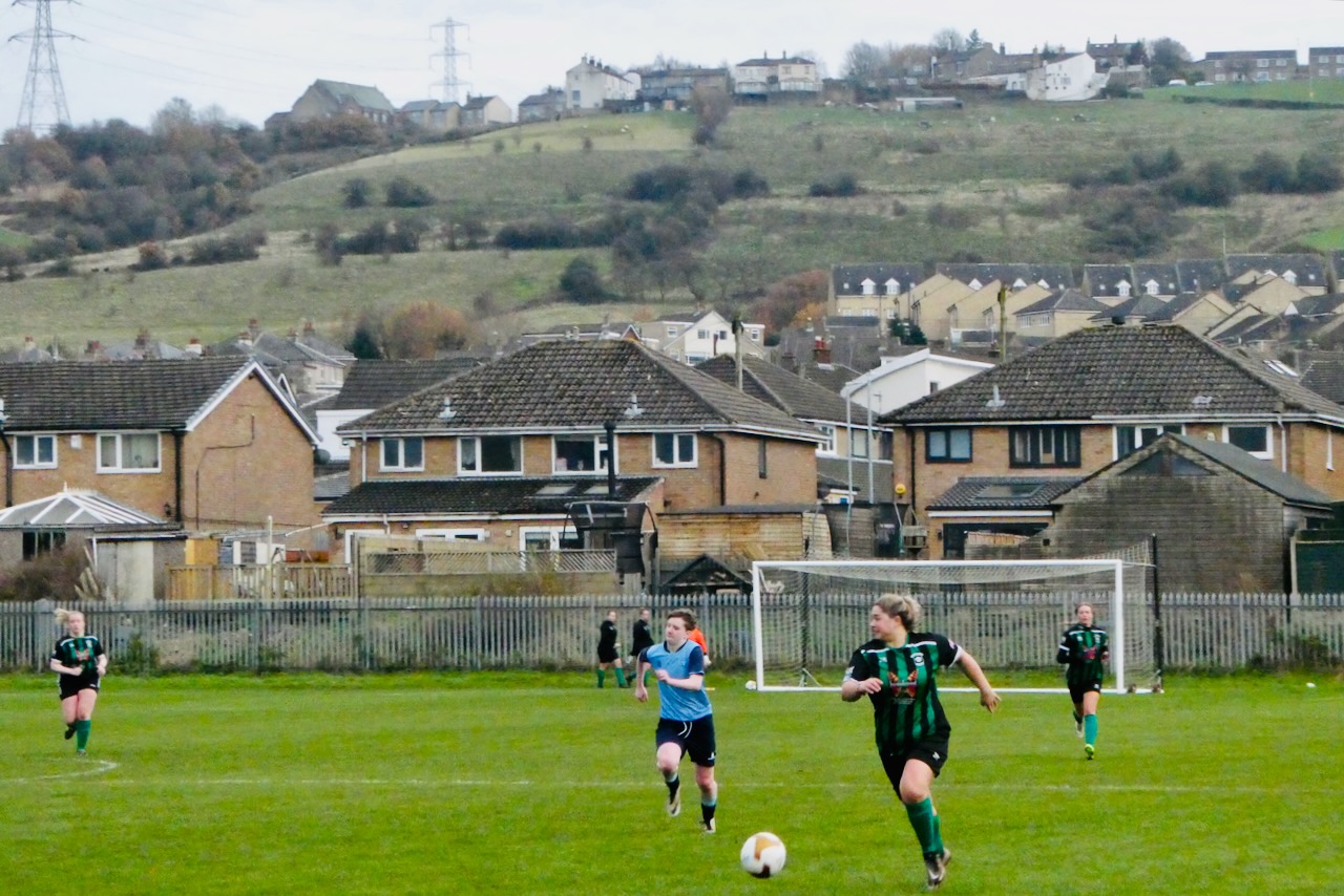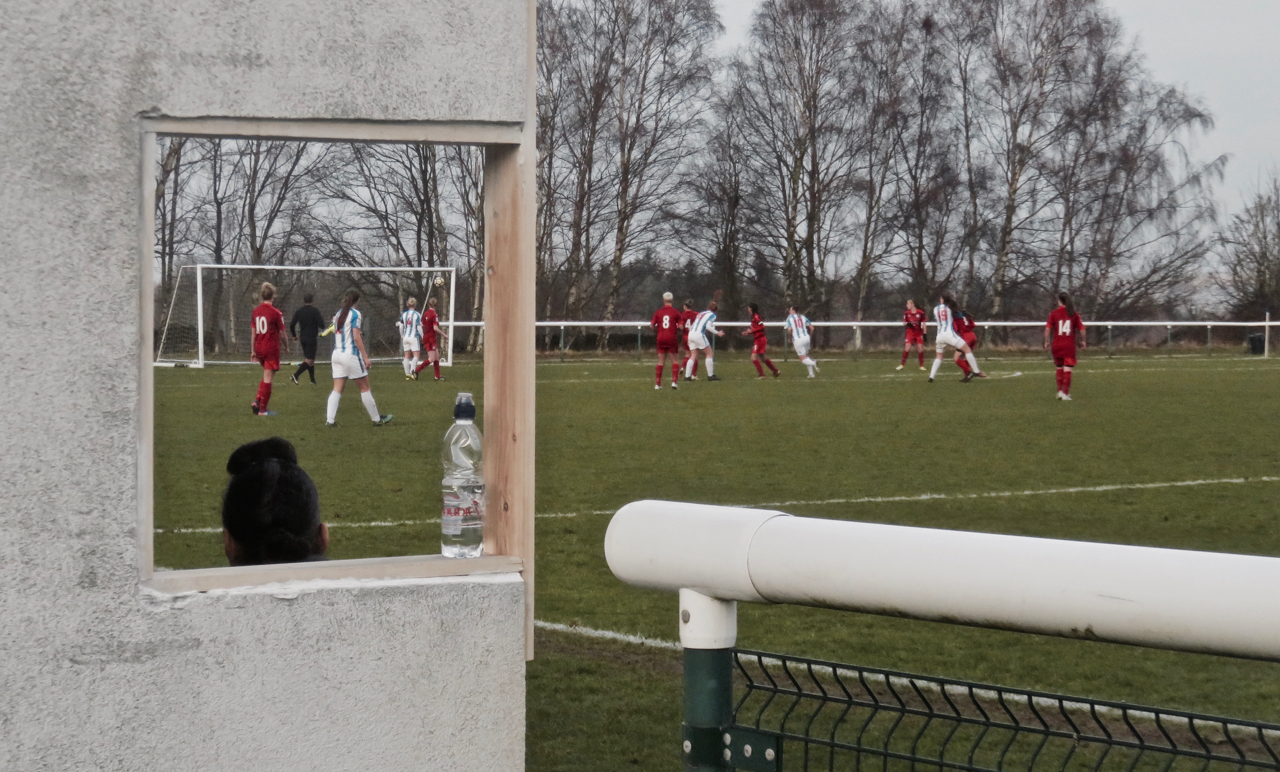 It’s been a while since the ‘pure football’ post went up, but what the hell, Old Earth — the ground of Huddersfield Amateur FC — has good landscape potential; in fact, the ground’s featured on here twice before, and constitutes the entirety of appearances for the town of Elland (because of course Huddersfield Amateur don’t play in Huddersfield). Sunday afternoon and the women take centre stage: visitors Golcar United, on the ball here in green and black, won this encounter 3-2. The focus seems to have worked out nicely on this shot.