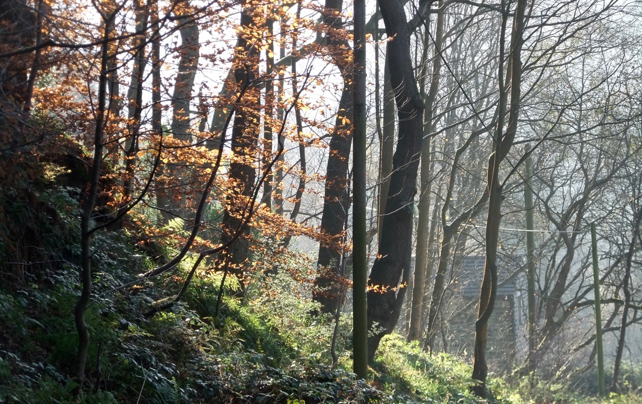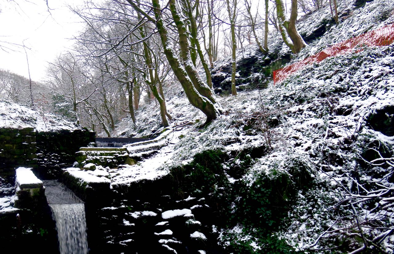 After the weather conditions depicted on the last couple of days, getting gradually closer to home, I guess it’s no real surprise that today saw snow on the ground in Hebden Bridge. I like this shot because it’s essentially monochrome, except for that stripe of red in the corner — a plastic barrier put up to stop people falling off the upper path and down into the water race here. Not far off this picture here, but not the same, which is why sometimes you can get away with doing multiple shots of the same place.